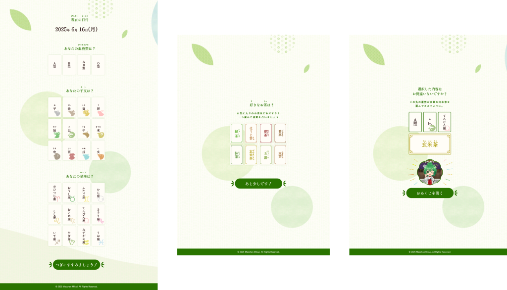 季節ごとに背景を変えたり、アニメーションを追加するなど、完全カスタマイズ可能なおみくじサービスです。