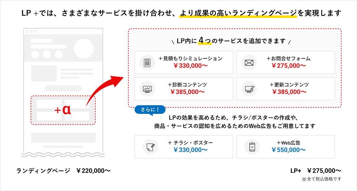 通常のランディングページ制作はもちろん、より成果の高いランディングページを実現するため、さまざまなサービスと組み合わせた「ランディングページ+α」の制作が可能です。目的に合わせた機能の組み合わせを、バリュー価格でご提案いたします。